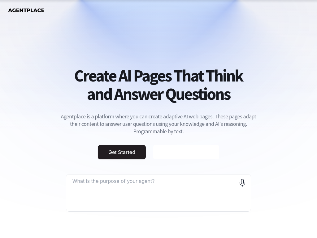 Agentplace is a platform that allows users to create adaptive AI web pages that can answer user questions using a combination of user knowledge and AI reasoning. It enables the creation of interactive websites and apps that leverage AI’s adaptability and common sense, allowing for dynamic user interfaces and voice interactions. Users can program the AI entirely with text, making it accessible and easy to use. The platform also offers features like instant publishing, image uploads, and a library of components for building web agents.