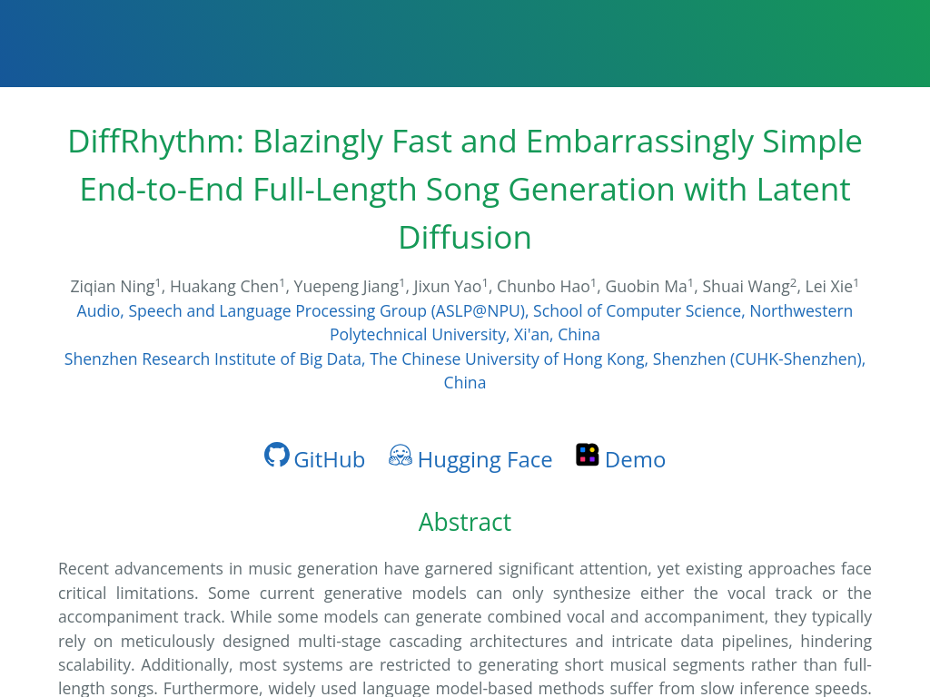DiffRhythm is a latent diffusion-based song generation model that synthesizes complete songs with both vocal and accompaniment for durations of up to 4m45s in just ten seconds. It is designed to be simple and elegant, eliminating the need for complex data preparation and requiring only lyrics and a style prompt during inference. Its non-autoregressive structure ensures fast inference speeds, making it scalable and efficient for music generation.