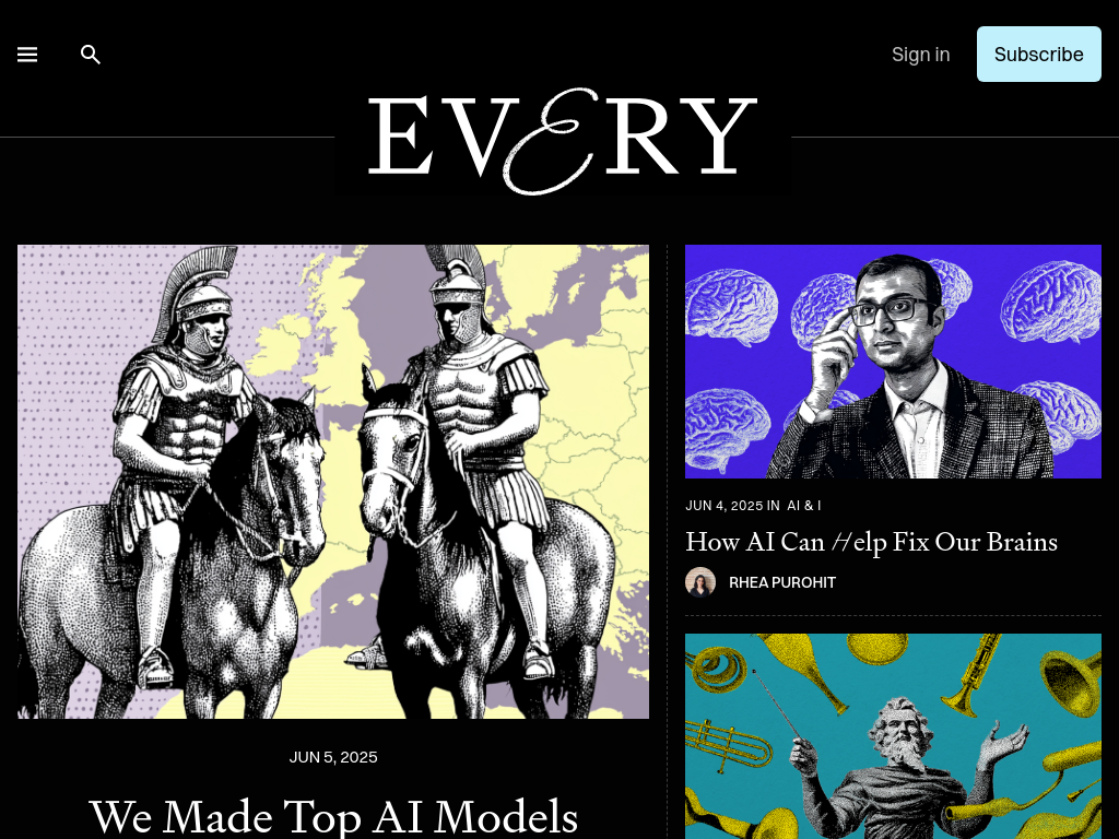 Every is a subscription platform featuring a collection of newsletters and content centered around productivity, business, and strategy, written by expert creators and operators.