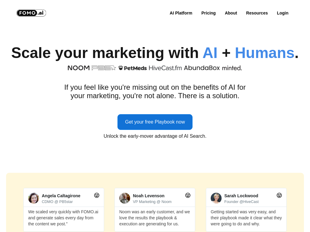 FOMO.ai is an AI-powered marketing platform that helps businesses scale their marketing efforts by leveraging AI technology and human expertise. It provides a playbook for creating high-quality content that answers audience questions, enabling brands to gain authority in AI search results and improve their online visibility. The platform aims to simplify the marketing process while maximizing ROI and growth opportunities for its users.