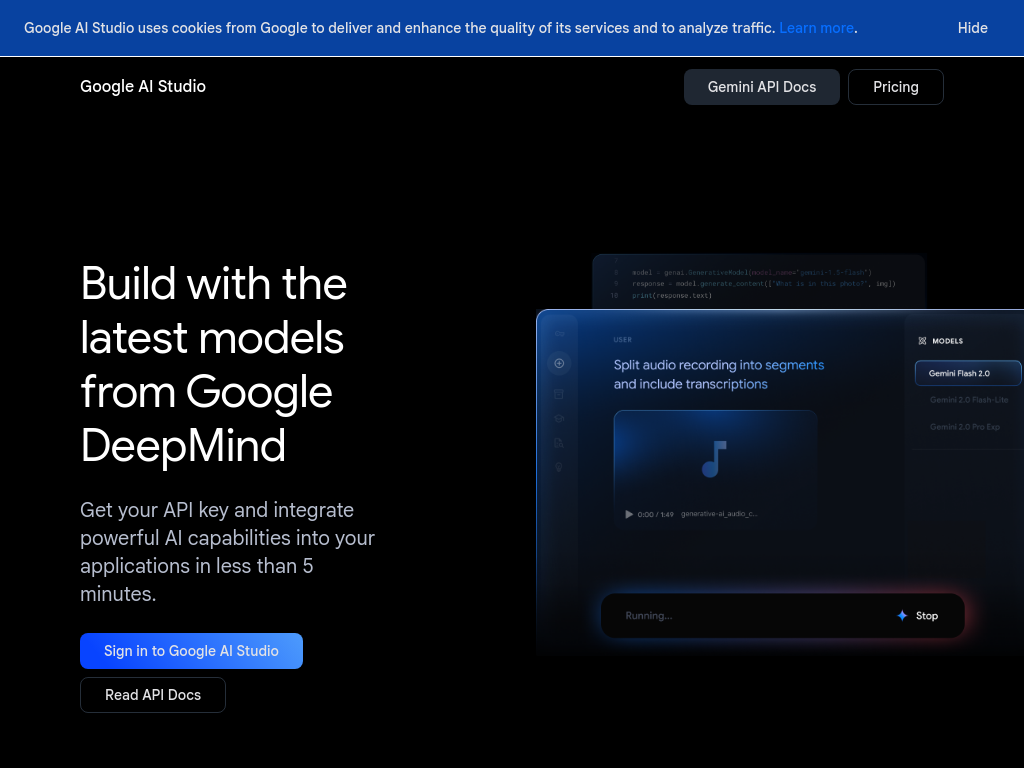 Google AI Studio allows users to integrate powerful AI capabilities into their applications quickly and easily using the Gemini API. It provides access to the latest AI models from Google DeepMind, enabling seamless understanding of text, code, images, audio, and video.