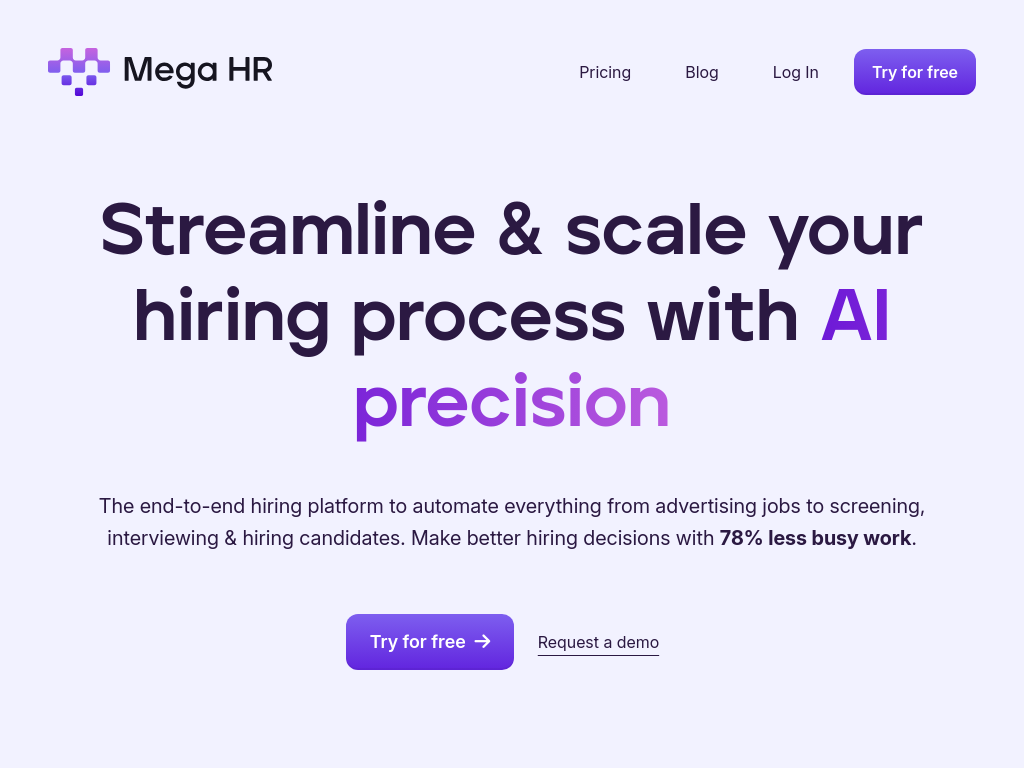 Mega HR is an end-to-end hiring platform that automates the entire hiring process, from job advertising to candidate screening, interviewing, and hiring. It leverages AI technology to reduce busy work by 78%, allowing teams to make better hiring decisions with less effort. The platform offers features like AI screening, interview scheduling, and data-driven insights to streamline the hiring process and improve candidate management.