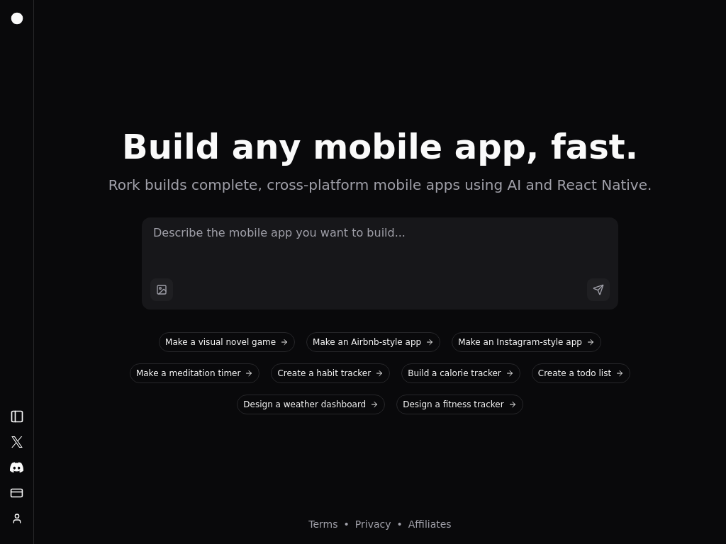 Rork builds complete, cross-platform mobile apps using AI and React Native. It allows users to create various types of applications such as visual novels, Airbnb-style apps, Instagram-style apps, meditation timers, habit trackers, calorie trackers, todo lists, weather dashboards, and fitness trackers.